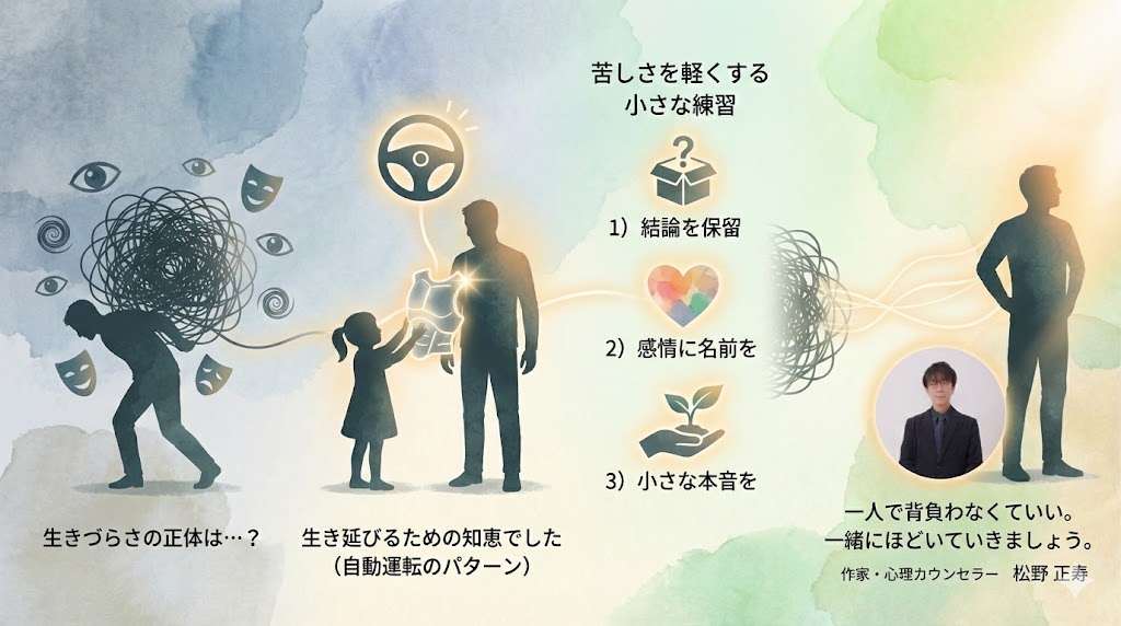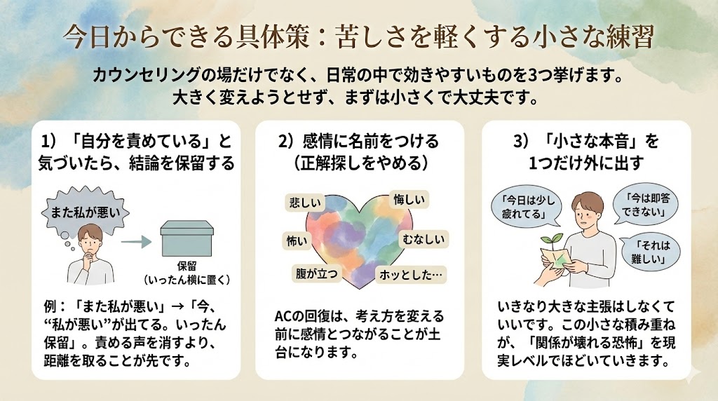 そんなときは、信頼できる人やカウンセリングなどに頼ってください。無理に変えようとしなくても大丈夫です。安全な場で少しずつ整理していけばいいんです。